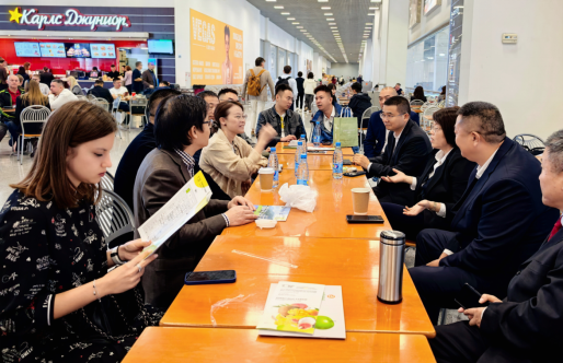 一是展会推介亮特色,主动交流寻商机。9月16日上午,代表团携带魔芋制品、冻干食品、新式茶饮、鱼子酱等乐山特色产品,走进2025年俄罗斯莫斯科国际食品展,主动对接采购商与经销商,同时深入调研俄罗斯本地食品消费需求、市场准入标准等,为乐山特色食品打开俄罗斯市场积累一手资源与潜在合作伙伴。下午,代表团拜访俄罗斯中国民营企业家总商会,翁瑞龙会长率核心企业家代表出席座谈。