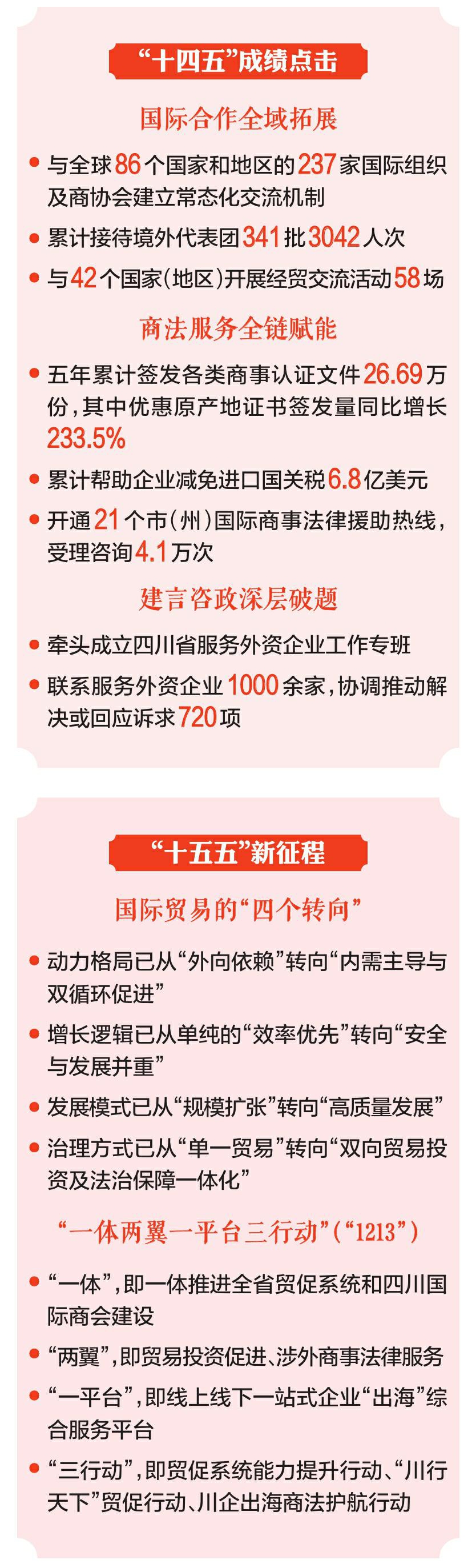 贸促体系从夯基垒台迈向协同高效:推动省政府与中国贸促会签署深化战略合作备忘录;创建川东北贸促系统联席机制,贸促协同服务区域发展能力持续增强;创新培育“蜀一蜀二”企业沙龙活动品牌,四川国际商会自主发展和服务能力明显提升。