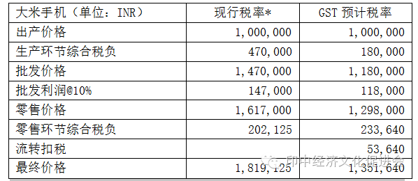 注释*:现行税率中,生产环节综合税负根据印度手机厂商数据推算约47%,零售环节综合税负根据印度税法规定约12.5%